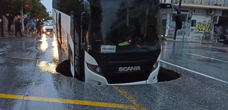 Ωστόσο, σήμερα νωρίς το πρωί ένα ιδιωτικό λεωφορείο έπεσε και εγκλωβίστηκε επί του οδοστρώματος στην οδό Εθνικής Αντιστάσεως, στην περιοχή Βότση, στην Καλαμαριά, καθώς φαίνεται πως από τον μεγάλο όγκο βροχής αλλά και το βάρος του λεωφορείου, να υποχώρησε το οδόστρωμα και το μπροστινό μέρος του λεωφορείου να βυθίζεται στον “κρατήρα” που δημιουργήθηκε.