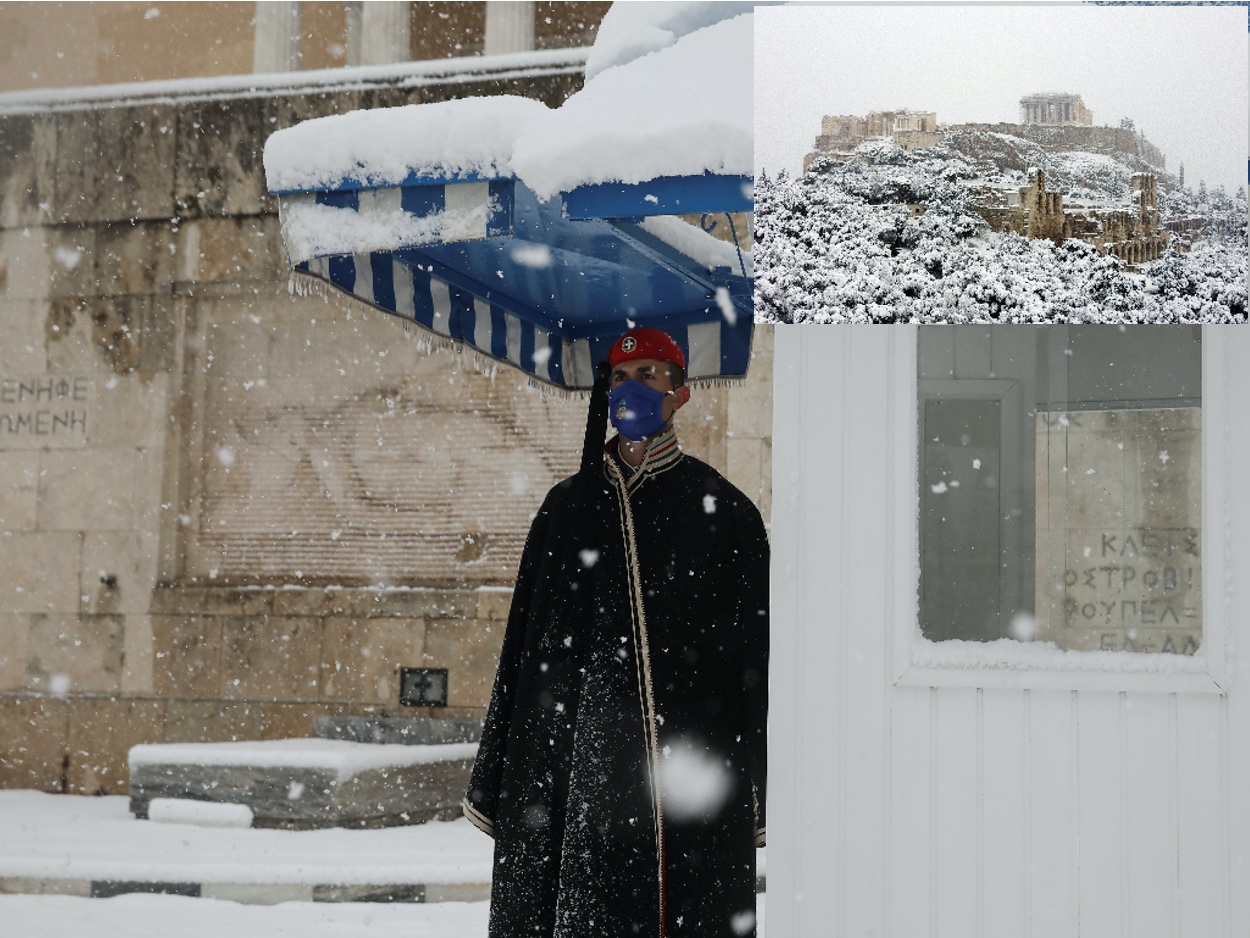 Η Ακρόπολη αλλά και η εικόνα του χιονισμένου εύζωνα στον Άγνωστο Στρατιώτη κλέβουν την παράσταση την σημερινή ημέρα που η κακοκαιρία Μήδεια σφυροκοπάει την Αττική.