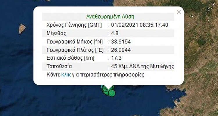 Δεν σταματά να τρέμει η γη στη Λέσβο καθώς πριν από λίγο υπήρξε νέα ισχυρή σεισμική δόνηση μεγέθους 4,8 βαθμών της Κλίμακας Ρίχτερ (Γεωδυναμικό Ινστιτούτο) και 5,1 σύμφωνα με το Ευρωμεσογειακό Ινστιτούτο. Η νέα δόνηση είχε εστιακό βάθος 17 χλμ και το επίκεντρό της εντοπίζεται στο θαλάσσιο χώρο 45 χλμ.